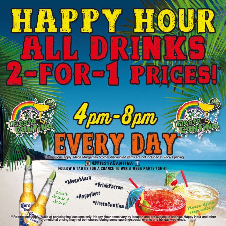 Fiesta Time 2-for-1 drink prices - where all regular priced drinks are 2-for-1! Or make your drink a double for regular price!